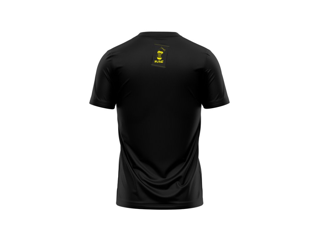 Detail: Decentní tkaný žlutý label Mutant našitý na zádech u krku (stejný jako u celého dropu).
